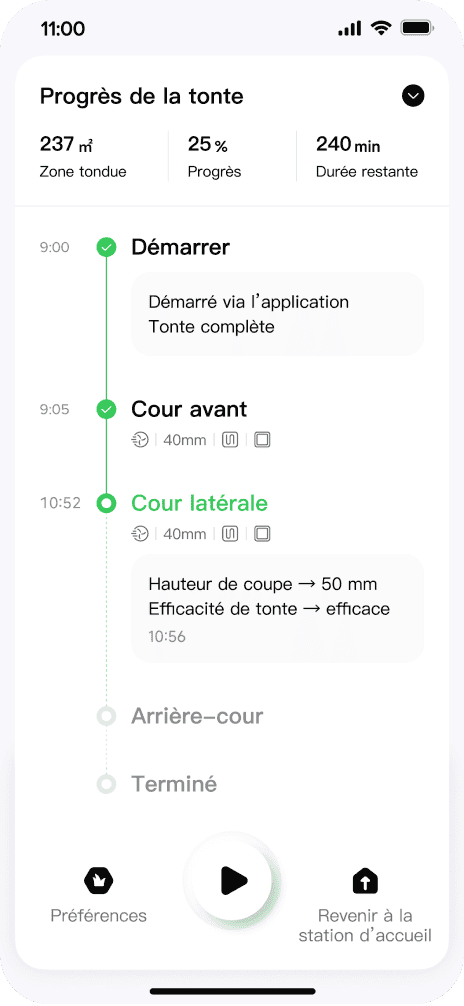 Suivez la progression de la tonte, les étapes clés et l'achèvement estimé à tout moment, n'importe où.